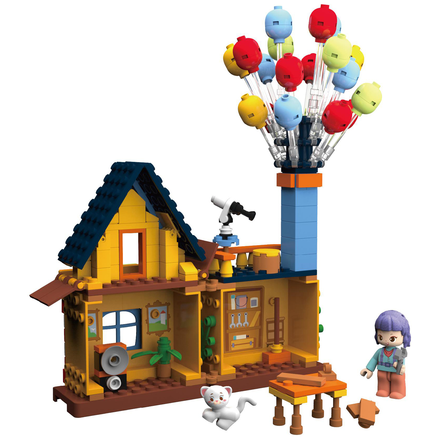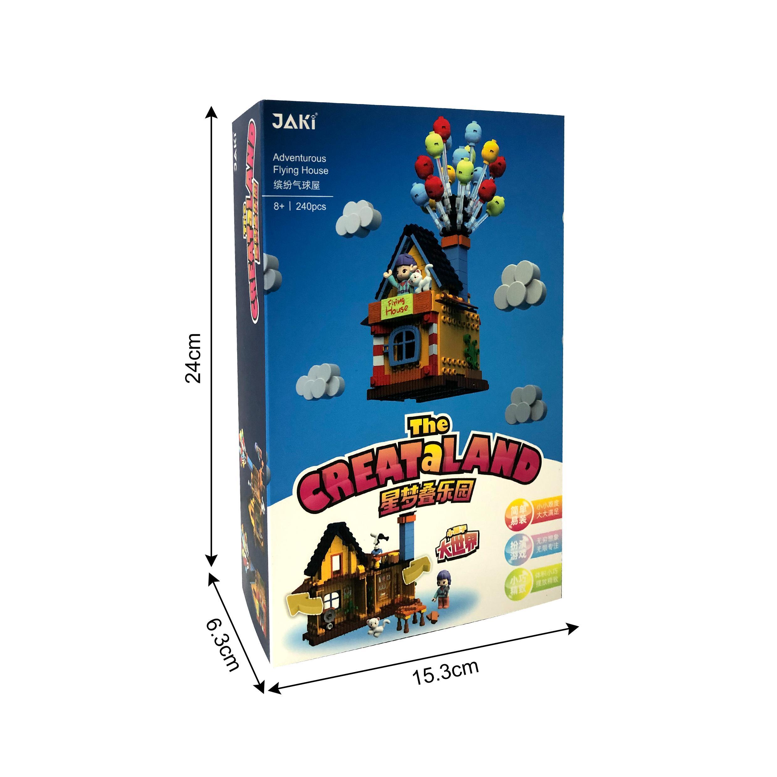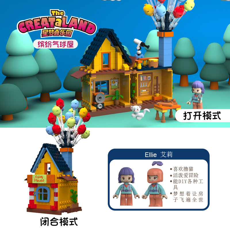 看過《飛天環游記》的小孩子也許會想,自己家的小屋子如果也能系上氣球,朝著夢想飛去那該有多好。現在就讓繽紛氣球屋來實現孩子們的小小心愿吧!首先,我們需要先把小屋子拼搭出來,這是一所雙層小屋,小屋上邊還有一個長長的煙囪。讓小屋飛起來可是一項偉大的工程項目,找找看工具箱里有哪些我們需要的工具吧!爬上二樓的瞭望臺,望遠鏡可以幫助我們制定路線,一切準備就緒,在煙囪上插上氣球,準備起飛吧!