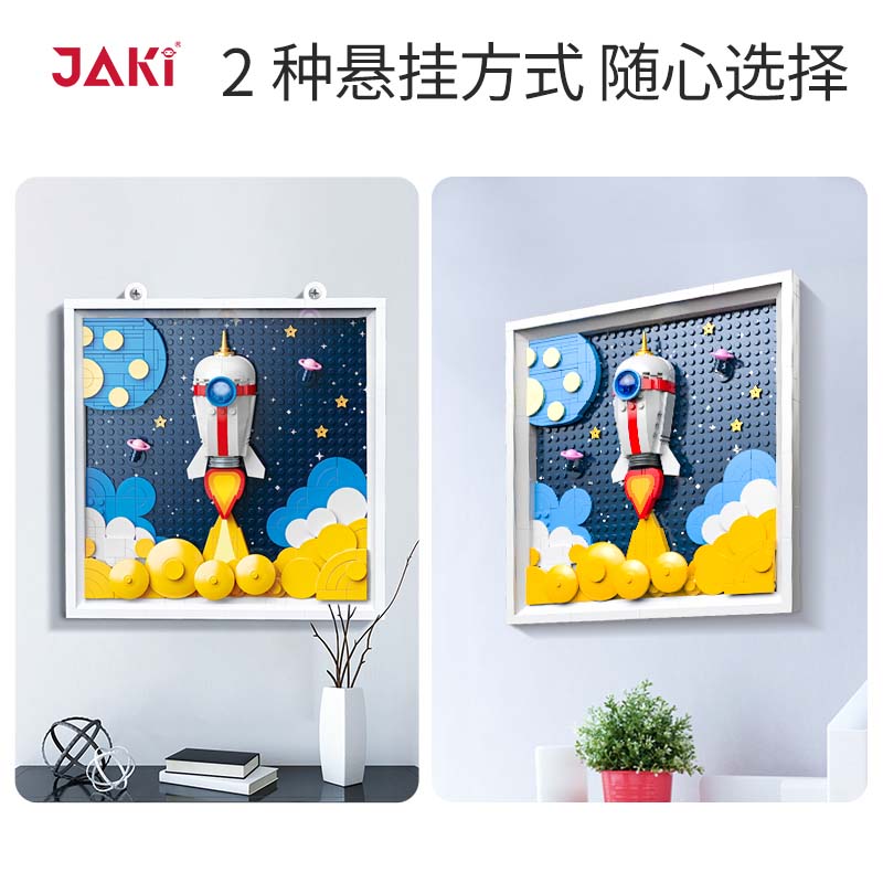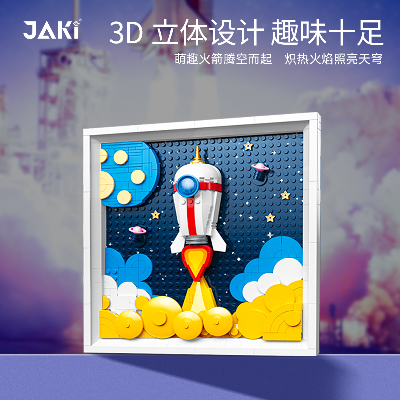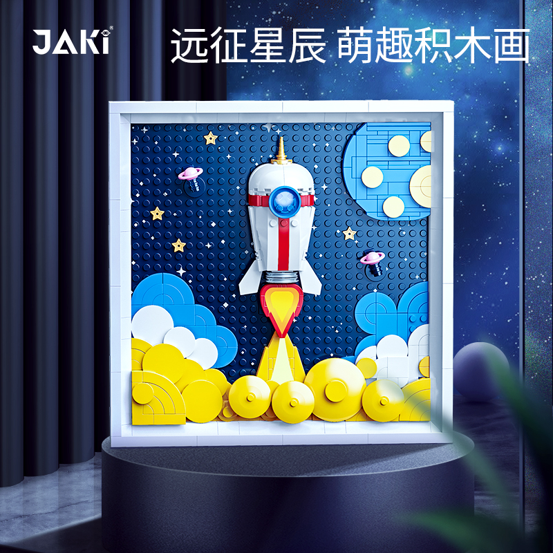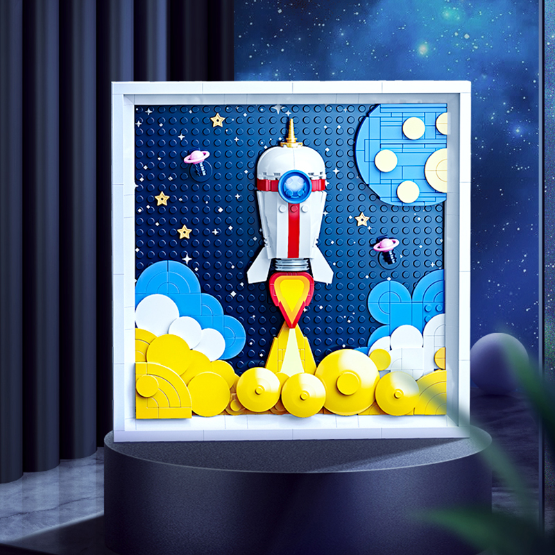 遠征星辰,萌趣立體積木畫;3D立體設計,層次感豐富,趣味性滿滿;萌趣火箭騰空而起,飛向浩瀚星空;金黃色的火焰,照亮天穹;