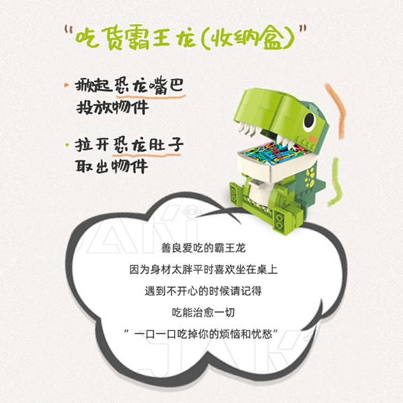 善良愛吃的霸王龍, 因為身材太胖平時喜歡坐在桌上, 遇到不開心的時候, 請記得吃能治愈一切, 一口一口吃掉你的煩惱和憂愁”